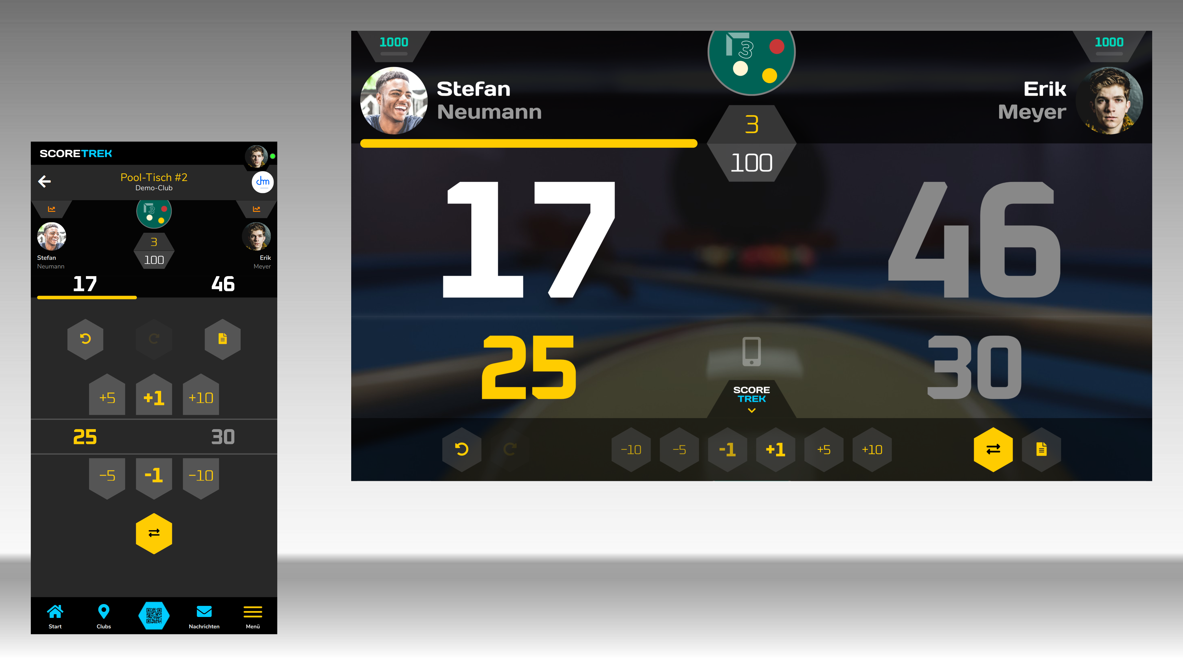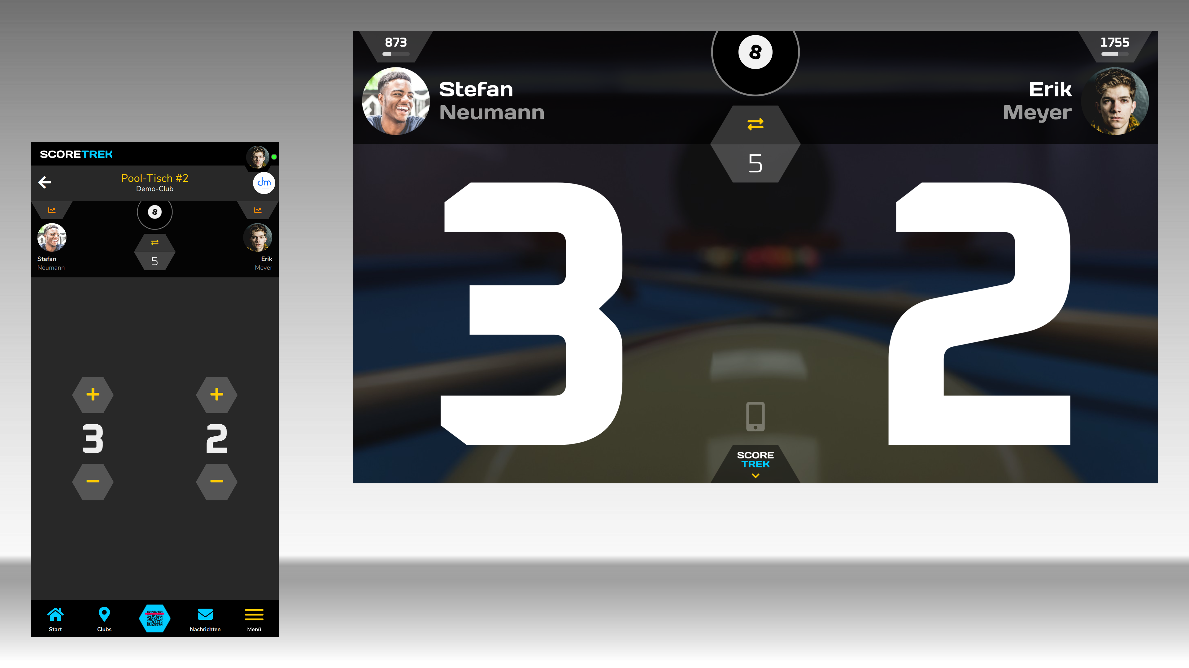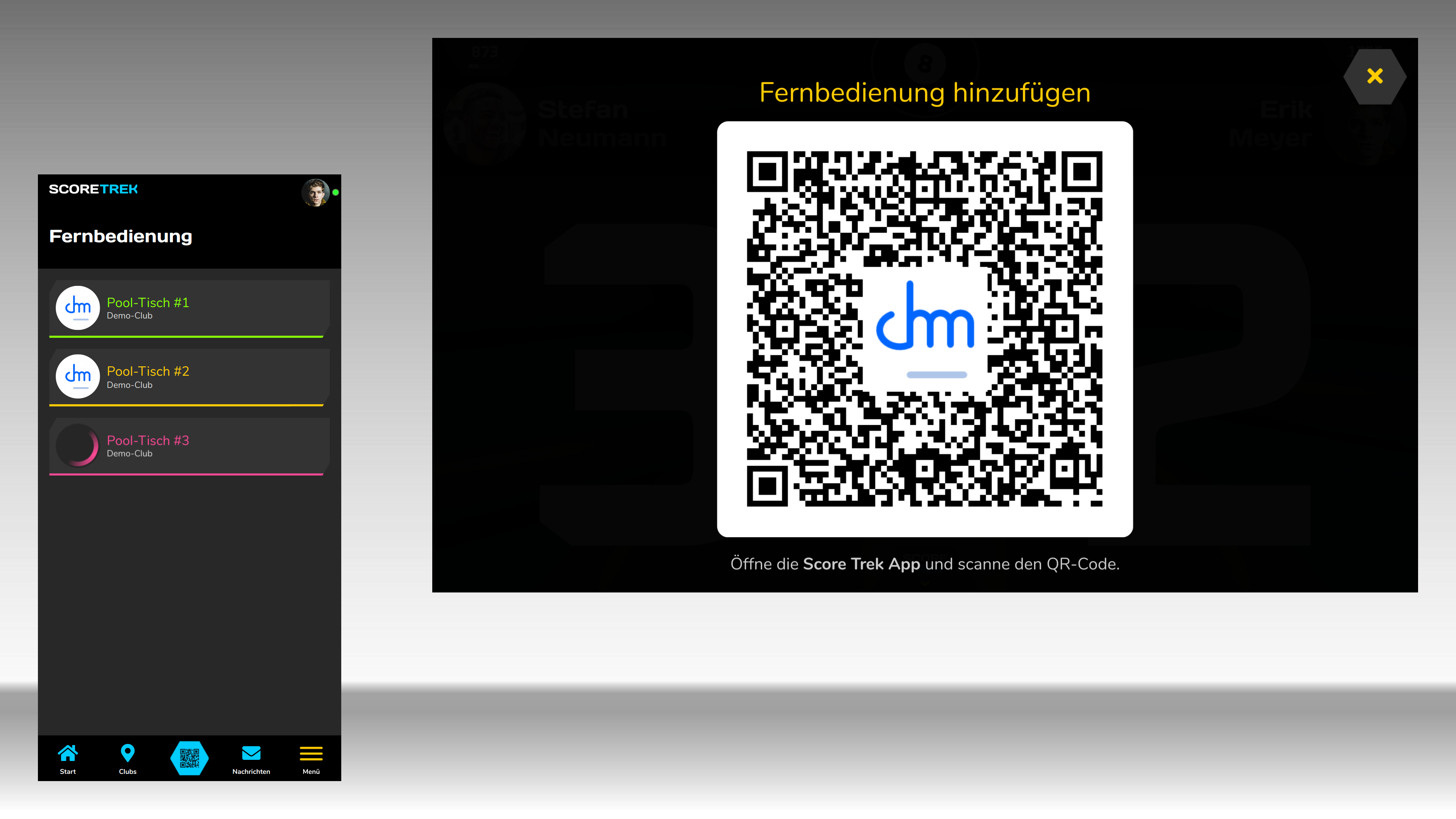 Wähle am Scoreboard "Fernbedienung hinzufügen" und nutze den QR-Code-Scanner in der Score Trek App. Du kannst beliebig viele Fernbedienungen verbinden. Tippe auf eine Fernbedienung, um das jeweilige Scoreboard zu steuern.