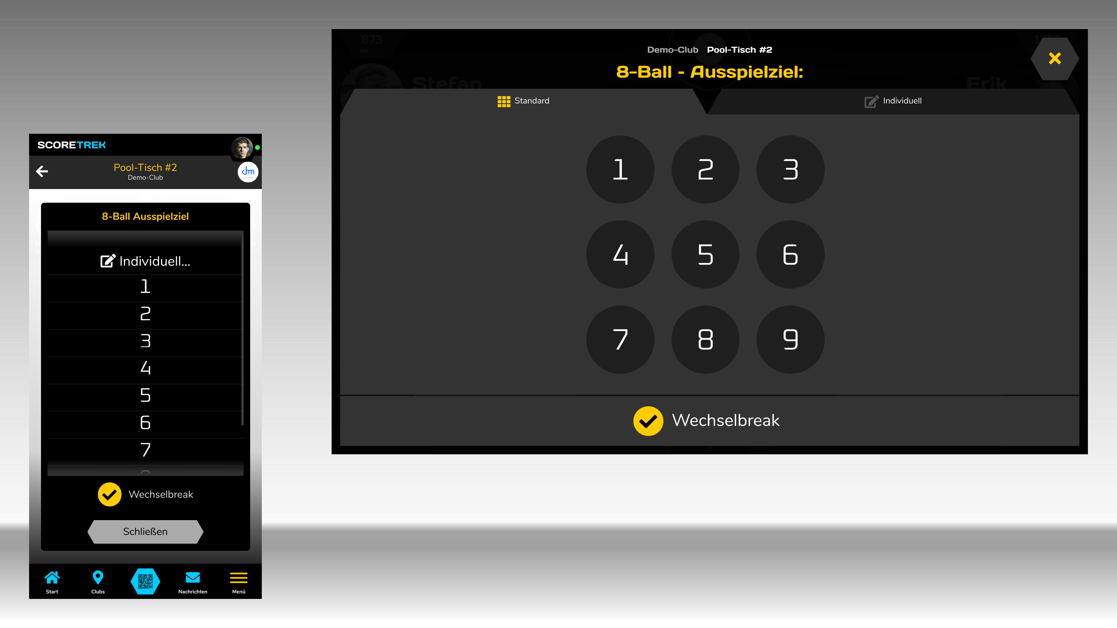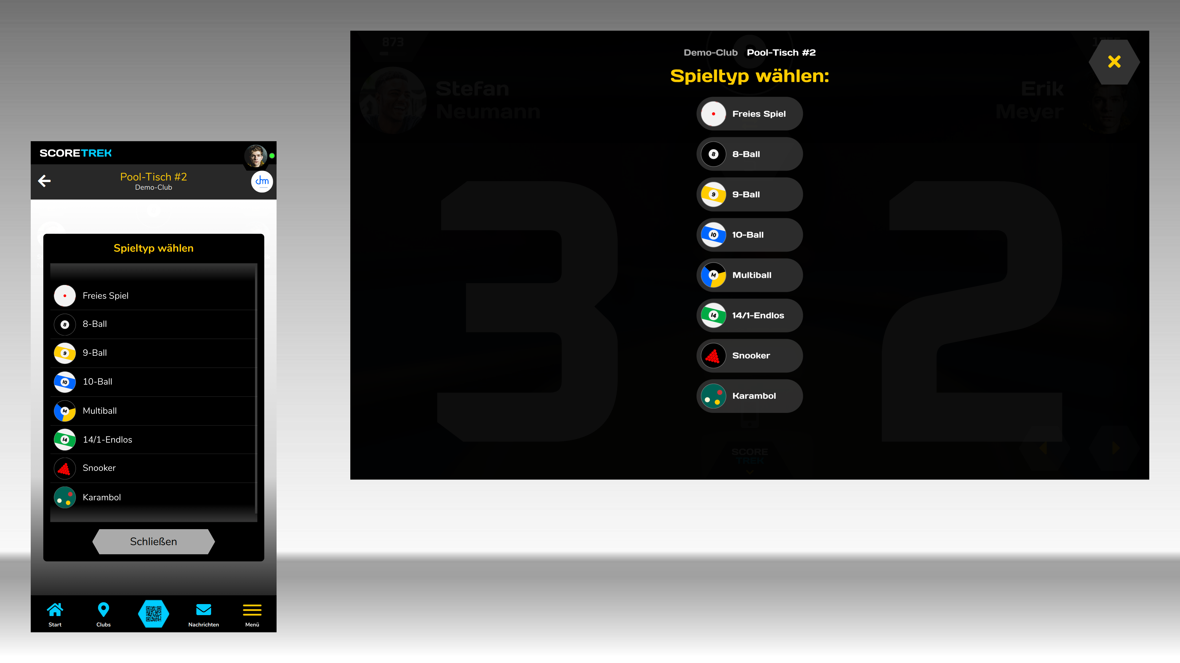 Bestimme die Spielart für das aktuelle Match. Du kannst die komplette Auswahl steuern, ohne das Scoreboard zu berühren.