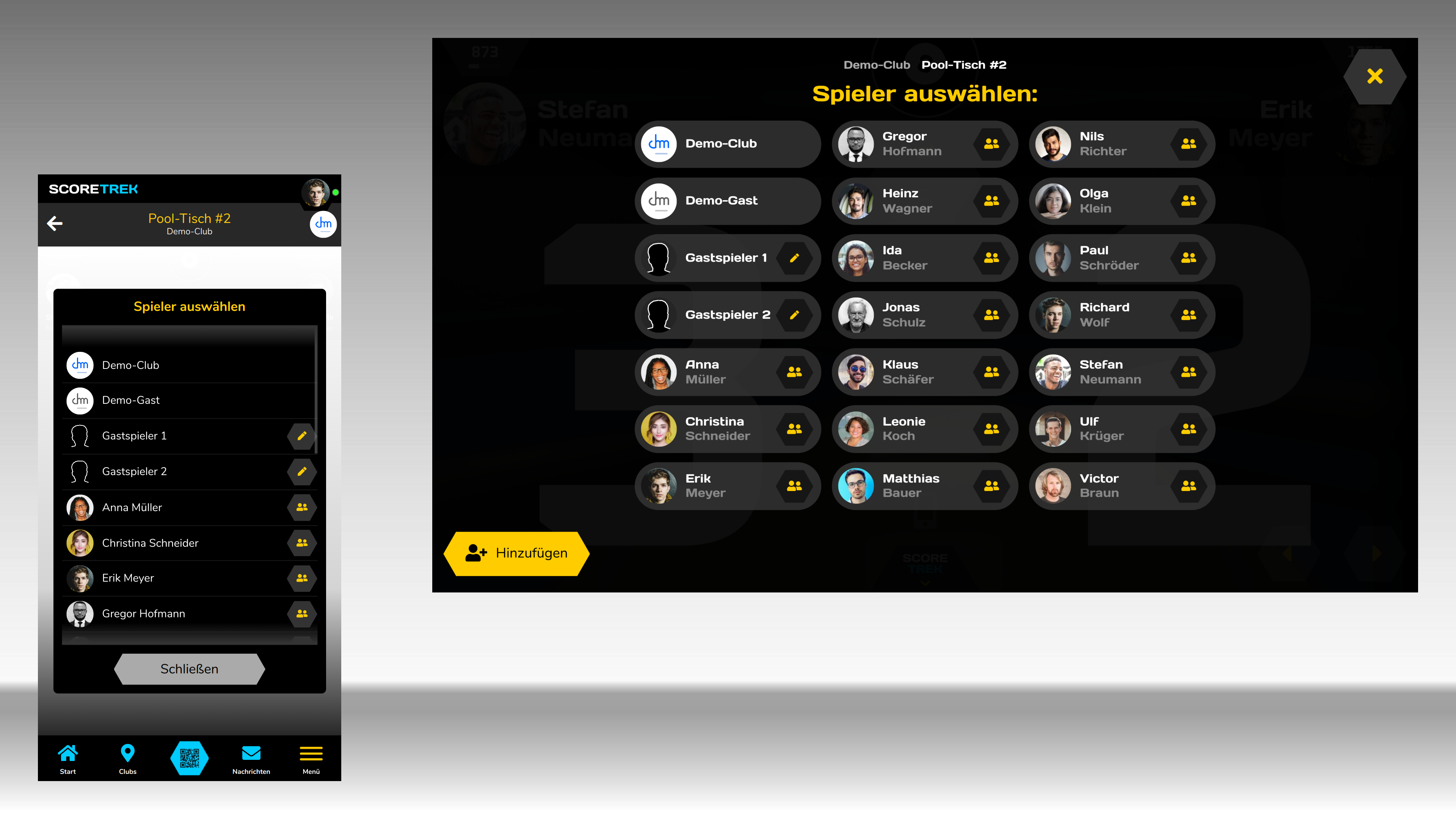 Wähle die Spieler für das aktuelle Match aus. Du kannst Einzel- und Doppelspieler auswählen und die Namen der editierbaren Spieler bearbeiten.