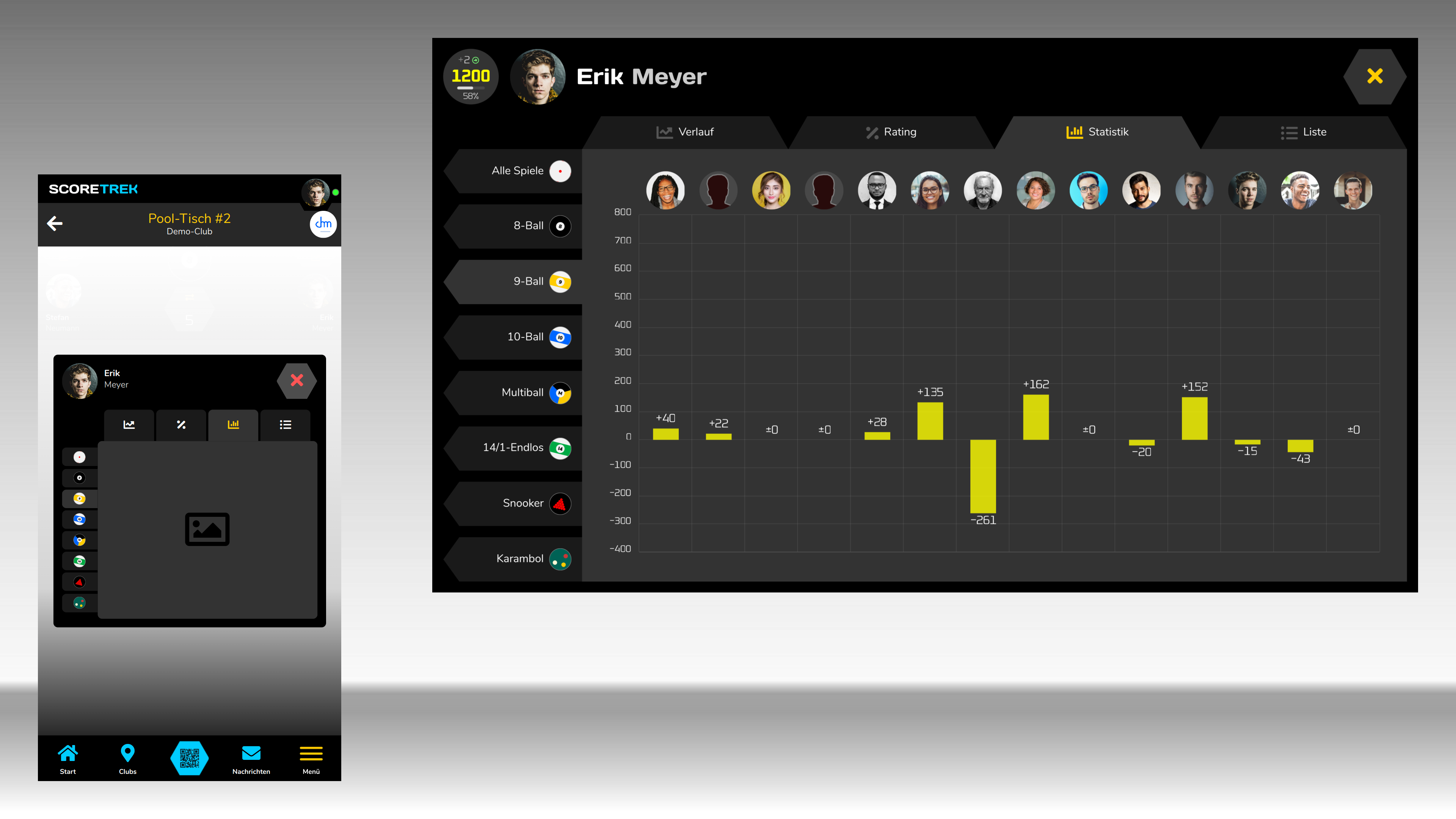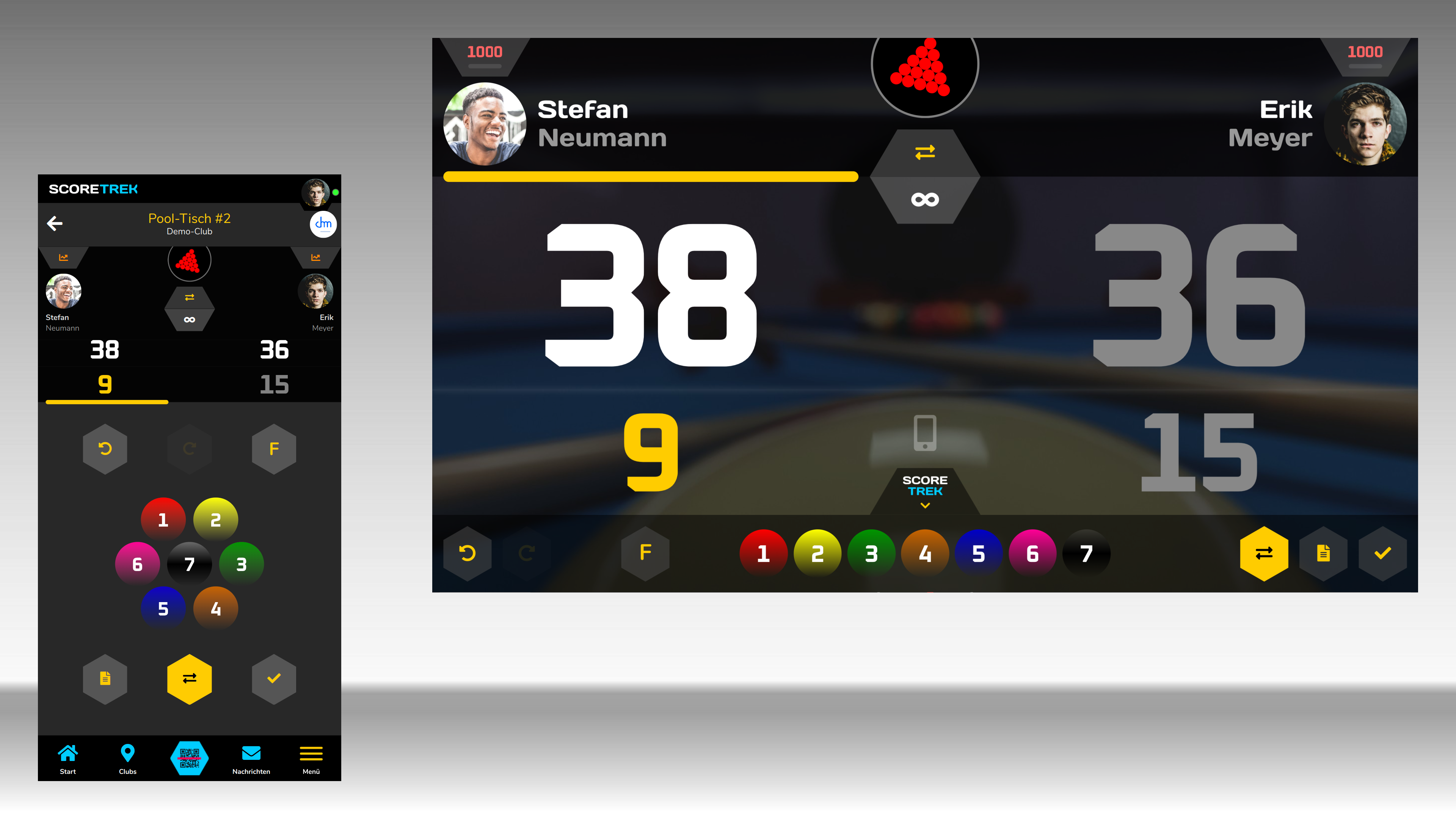 Im 14/1-Endlos-Modus tippst du die Punkte genauso einfach ein, wie direkt am Scoreboard. Fouls, Rückgängig und Wiederholen sind ebenfalls verfügbar.